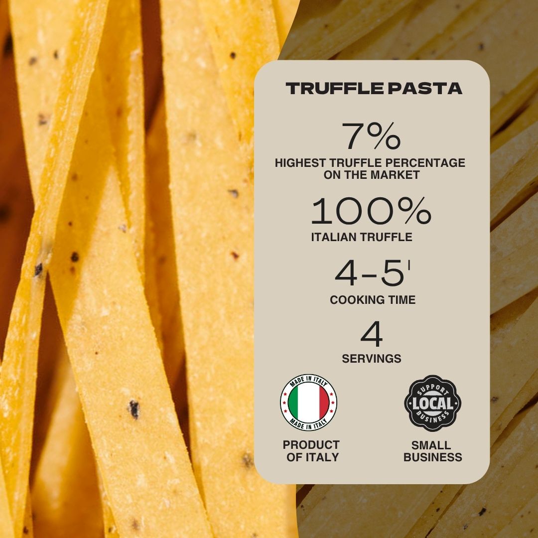Durum wheat semolina, pasteurized fresh eggs 20%, porcini mushrooms (Boletus edulis and relative group) 7%, Italian summer truffle (Tuber aestivum Vitt.) 3%, flavors. May contain traces of soy.
